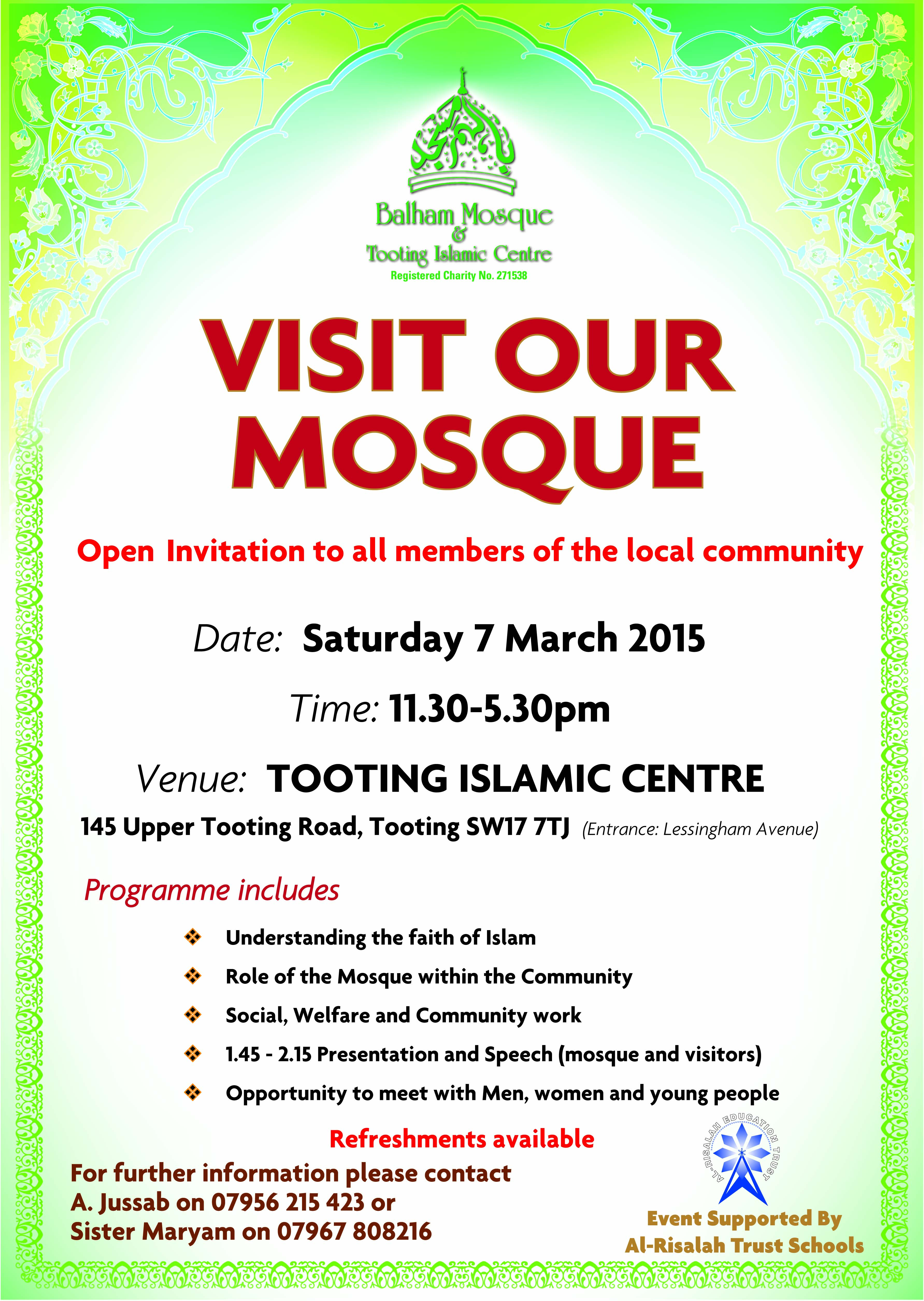 Saturday 7 March 11.30am – 5.30pm Tooting Islamic Centre Open Day. Visit Our Mosque, 145 Upper Tooting Road, SW17 7TJ, with presentations at 1.45pm – 2.15pm.